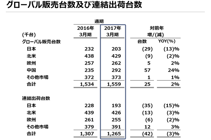 マツダ グローバル販売台数及び連結出荷台数:2017年3月決算説明会資料