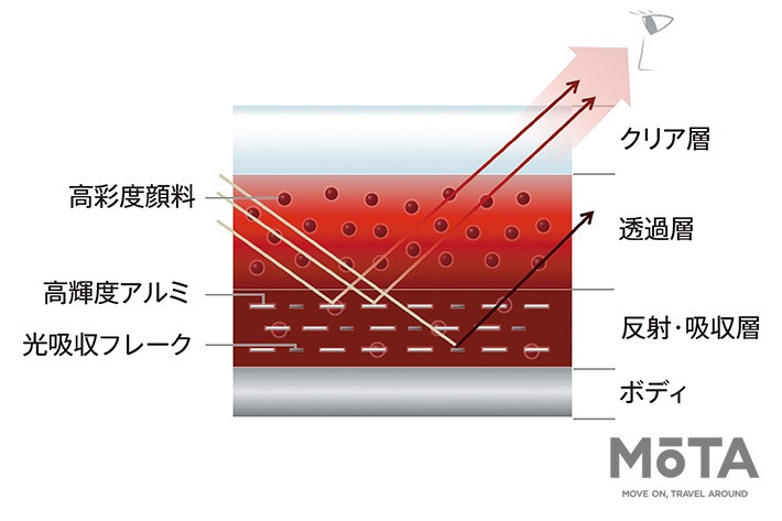 塗装の構造を詳しく見ていくと、一層めには反射層には光を反射、吸収させる「高輝度アルミフレーク」「光吸収フレーム」を均一に分布。そして2層目となる透過層は、彩度を高めた新開発の顔料を使用し、3層目としてクリアーが塗装される。