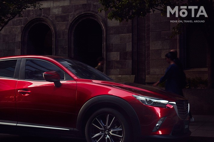 日中は光を吸収し、まるでキャンディのような艶やかな赤を発色する。写真のCX-5のように、前後フェンダー部やドア部の曲面で綺麗に反射し立体感がくっきりと生まれている。