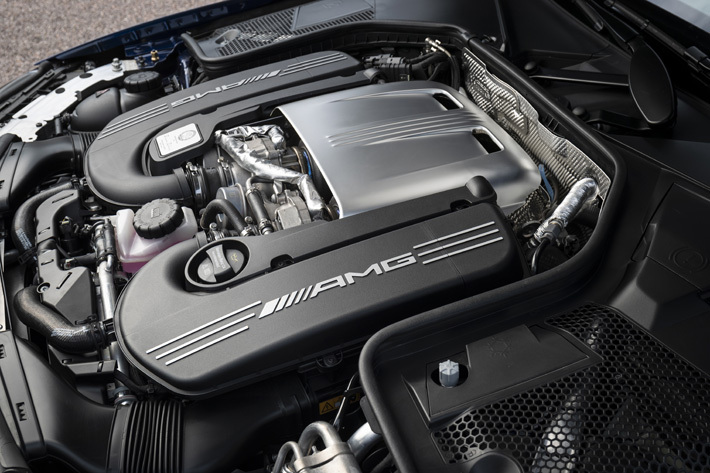 AMG GTと同じ基本設計となるV8 4リッター直噴ツインターボのパワートレインは、C 63が476ps/650Nm、よりスポーツ性を高めたC 63 Sが510ps/700Nmとスペックの変更はないが、トランスミッションはATベースながらトルクコンバーター廃して湿式多版クラッチを採用した「AMGスピードシフトMCT」を7速から9速に多段化。更に駆動系は、従来モデルのC 63が機械式LSD、C 63 Sは電子制御LSDだったが、新型は全車電子制御LSDにアップデートされている。