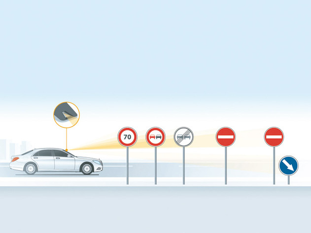 アクティブディスタンスアシスト・ディストロニック(自動再発進機能付)は、ステレオマルチパーパスカメラとレーダーセンサーにより、高速道路などの走行時に先行車を認識して、速度に応じて車間距離を調節する。減速が必要な場合、アクセルおよびブレーキを自動調整してスムーズに減速し、先行車が停止した場合は自車も停止。