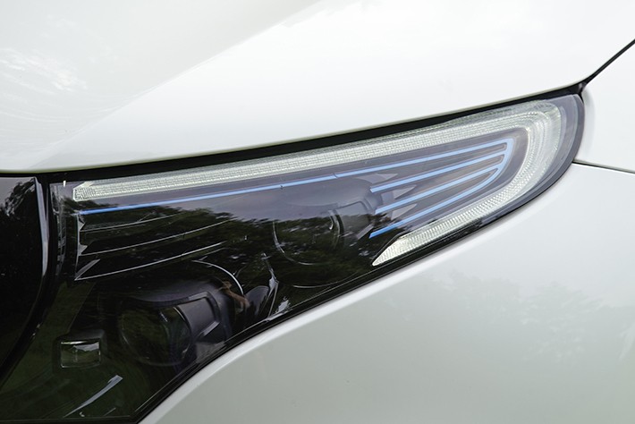 EQCは、サイズ的にGLCとあまり変わらないけれど、ボディ各所にはEQブランド独自のエッセンスが与えられている。EVであるから、グリルはフレッシュエアを取り込むよりも空気抵抗を減らすためにヌルっとさせつつ、センサー類をたっぷりと詰め込むために大きめのマスクに。笑ったようなボトムのデザインはちょっとばかり愛嬌がある。