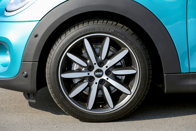 クーパーの標準装着は16インチだが、写真はオプションの17インチアロイホイール「プロペラスポーク」+205/45R17タイヤ《ミニ クーパー コンバーチブル[ボディカラー:カリビアン・アクア・メタリック(オプション装着車)]》