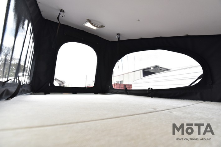 ポップアップテントもオプションで装着できるため、さらに就寝定員を確保することができます。