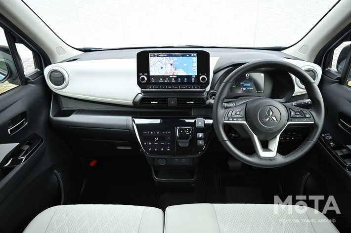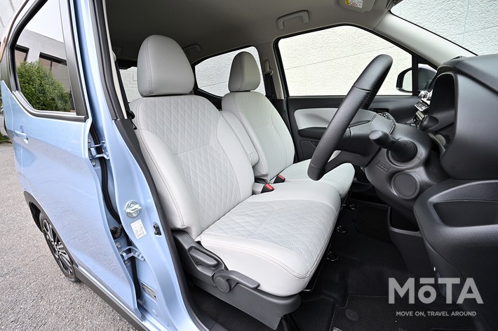 同じくPにプレミアムインテリアパッケージ(5万5000円)を加えると、シート生地が合成皮革&ファブリックに上級化され、内装色もライトグレーに変わる。新型eKクロス EVは電気自動車とあってノイズが小さく乗り心地も優れ、快適性が高い。プレミアムインテリアパッケージを加えると、上質感が一層際立つ。