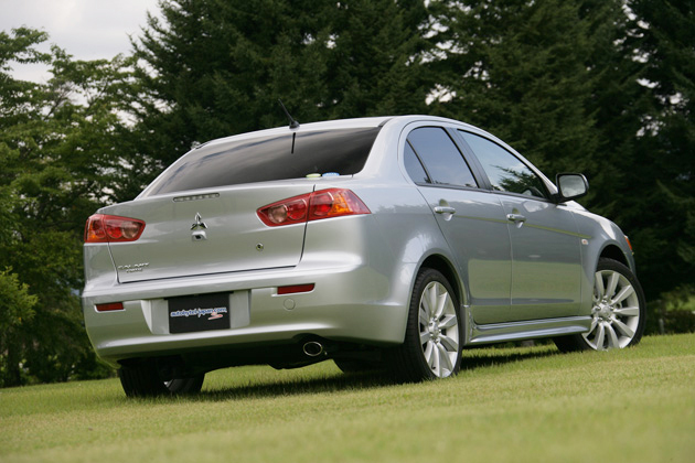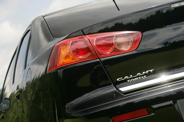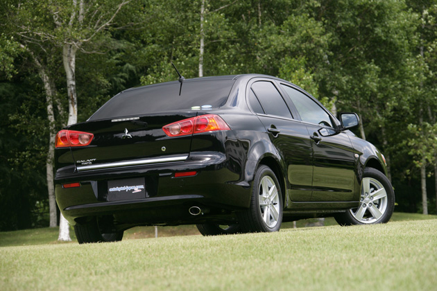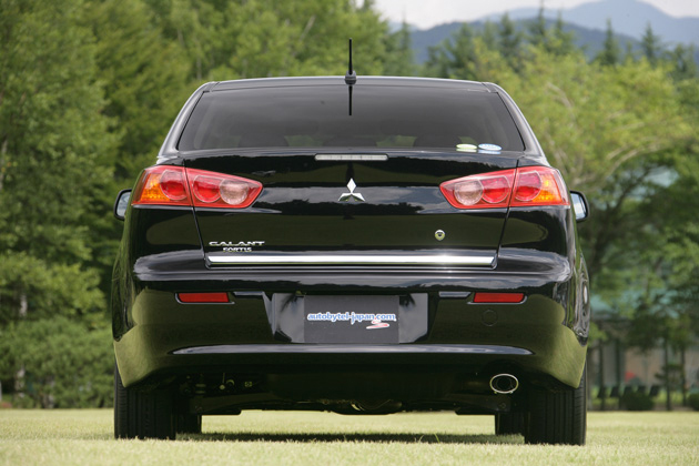 Cピラーのリアエンドをトランクリッドへと続く一体感を持たせたデザインとしてことで、ショートデッキにフォルムの中に、伸びやかでダイナミックなイメージを創出するギャランフォルティスのリアビュー。大径タイヤをしっかりと包み、フェンダーの張り出しを強調したボディシェイプが、スポーティな佇まいを印象付ける。