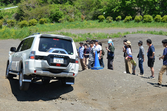 「自走コース」では、自らがステアリングを握って悪路を走る前に、オフロード走行を熟知したベテランインストラクターとともにオフロードコースを歩き、走行時の注意点や“走り方”を学ぶ。コースにはモーグル(凸凹)エリア、すり鉢エリア、小さな半径で路面が斜めになったカーブ、岩場の坂道などの難所が設けられていた。「こんなところをクルマが走れるんだ」と思うほどの悪路(というか道じゃない!)だが、実際にパジェロでデモ走行が行われると、パジェロは難なくクリアしていく。すり鉢は深く、覗き込むだけでも怖いので、走る前に目で確認し、走り方をレクチャーしてもらえるのは実際の走行時に大きく役立つのだ。