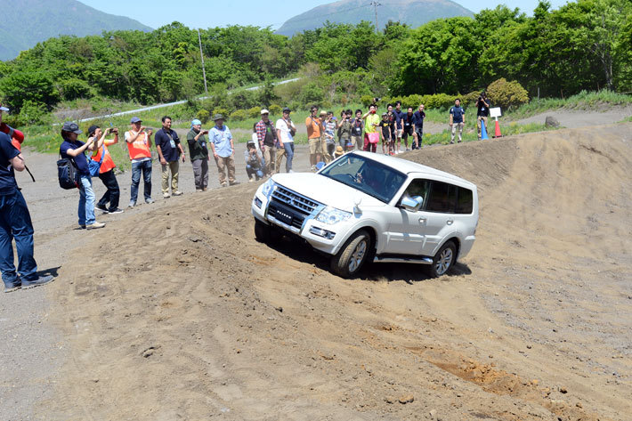 増岡選手によるデモ走行も見ることができたが、ラフロードとパジェロを知り尽くした増岡選手は、あえて「そこ走ったら倒れちゃう!」と思わず声が出てしまうような、すり鉢の角度が急な場所を(わざわざ)選んで進んでいく。パジェロって、スゴい!と素直に感動した!