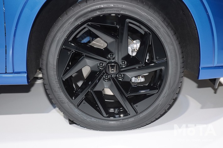 ホンダ純正アクセサリーであるLEDフォグライト、ドアミラーカバー、テールゲートスポイラー、リアライセンスガーニッシュはそのまま装着しながら、ブラックエンブレム、フロントロアスカート、サイドロアガーニッシュ、リアロアガーニッシュ、19インチアルミホイール「MG030」は、純正アクセサリーをベースに特別な加飾を施した「東京オートサロン2023仕様」を装着しています。