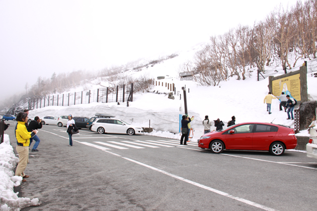 静岡県側の富士山「新五合目」に到達したら、なんと溶け切れていない雪がたくさん残っていた。記念写真を撮影している人の多くは外国人観光客で、あいにくと濃い霧が発生していて、せっかくの富士山の雄姿が観られないのが可哀想だった。昭和テイストたっぷりの土産物屋で、西洋人の若者観光客が土産物の木刀の品定めを真剣に行っていたのが可笑しかった。