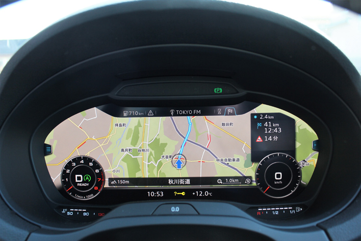 ここで少しバーチャルコックピットを試してみる。ステアリングスイッチで簡単に変えられるそれは、ナビ画面がメーター内に表示されるので、視線移動を少なく、非常に見やすいものだ。しかし、交差点手前などで画面の拡大、縮小が自動で行われるので、慣れるまで気にはなった。それから、燃料系が小さく、どのくらい残っているのか一目で確認できなかったのは不満である。