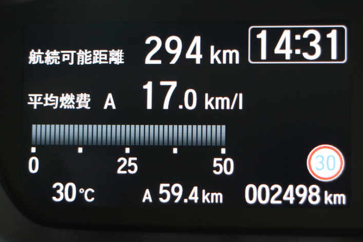 なお、新型N-BOXは燃料タンクがFF車で27リットル、4WDに至っては25リットルと軽自動車としても小さい感があり、筆者が受け取るまでに編集部スタッフが満タン(厳密ではないものの)から約200km走行していたため、テスト開始までに高速道路を中心に燃料残量警告灯が点くまで走ってみたところ、燃料残量警告灯が点いたのは483km走行時点で、483km走った燃費は20.0km/L、その後ガソリンを満タンした給油量は23.8リットルだった。軽自動車で多い市街地での使用で燃費をリッター15kmと仮定しても1回の給油で350km程度は走れることが確認できた。軽自動車が市街地を中心に使われ、走行距離も少ない使われ方が多い加味すれば問題ない航続距離といえるだろう。