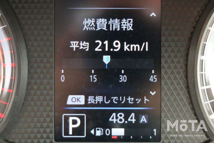 eKクロスT (4WD)は郊外路で21.9km/Lという、ターボ+4WDの軽ハイトワゴンということを考えれば絶対的、相対的ともに納得できる燃費を記録した。