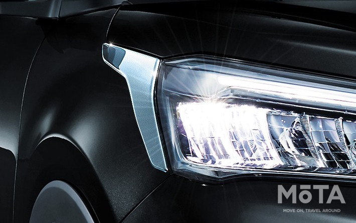 こちらでは、従来のフロントグリルカバー、バックドアガーニッシュ、サイドドアガーニッシュに加え、メッキの煌きが後方へと駆け抜けることで、アイコニックでプレミアムなフロントフェイスを演出する「ヘッドライトガーニッシュ」を新設定している。