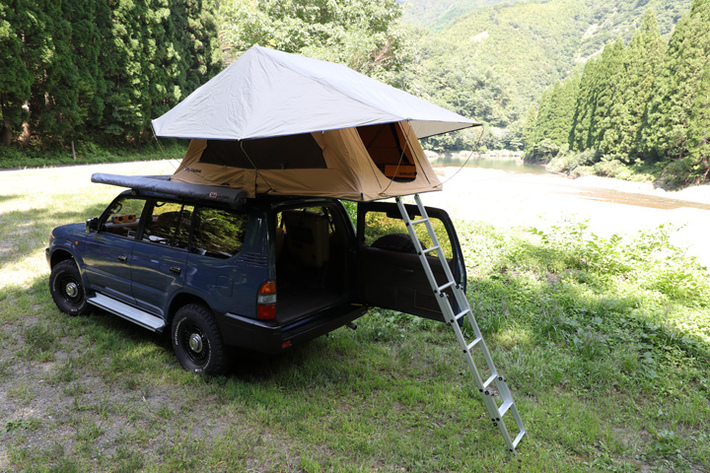 キャンプ場でテントを張るのは、慣れないと億劫な作業だが、こちらのルーフテントを展開するのは超簡単。専用カバーを外し、ハシゴを下ろしていくとテントが容易に立ち上がる仕組みになっている。