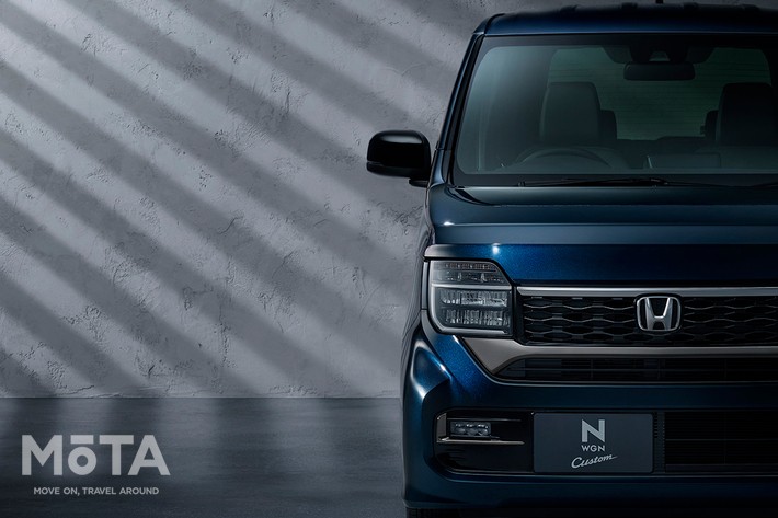 今回のマイナーモデルチェンジでは、N-WGN Custom(カスタム)がよりスポーティかつ存在感を高めたデザインに進化します。フロントグリルにはより力強さを感じさせるダーククロームメッキ仕上げのハニカムグリルを採用。