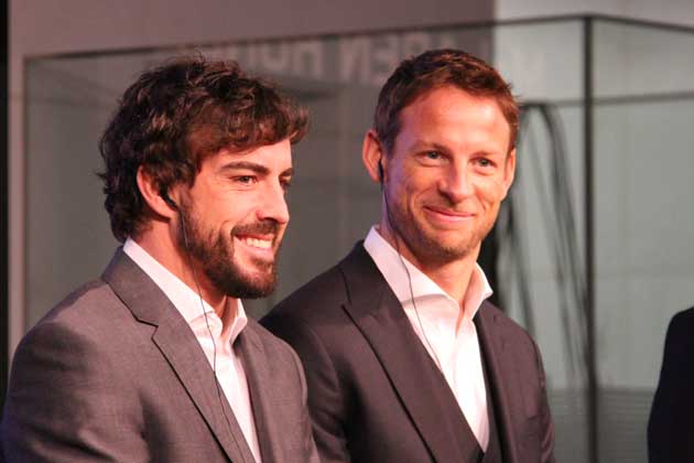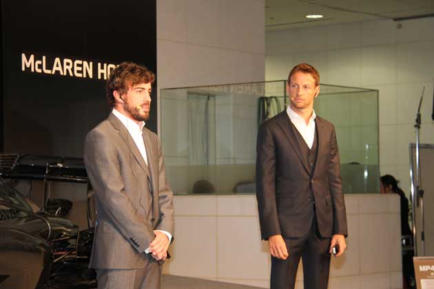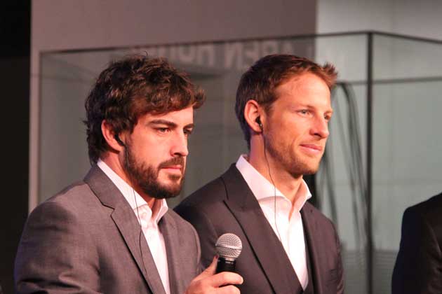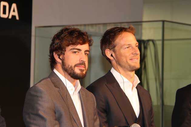 (左)フェルナンド・アロンソ選手(中)ジェンソン・バトン選手(右)マクラーレン デニス氏【2015 F1グランプリ】