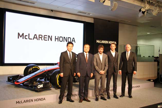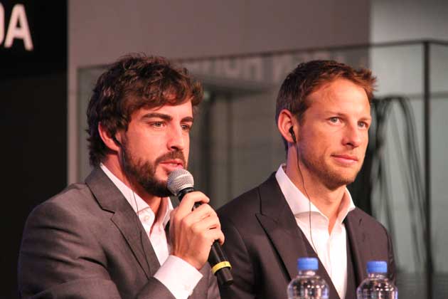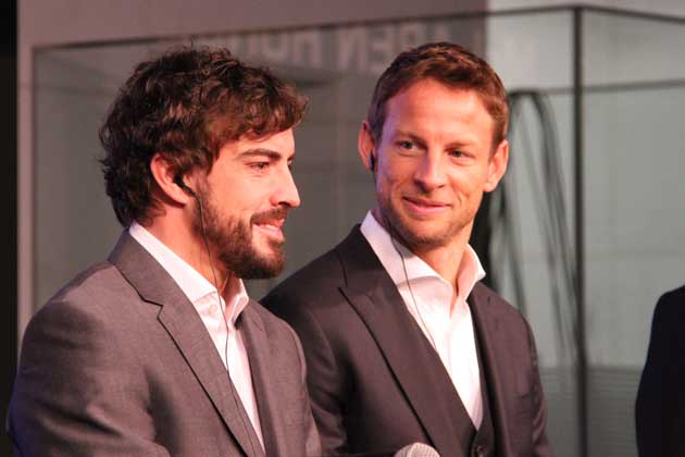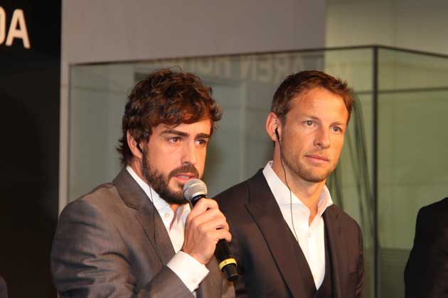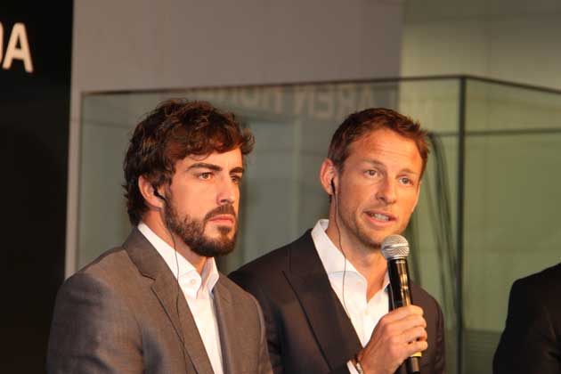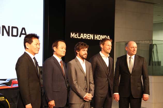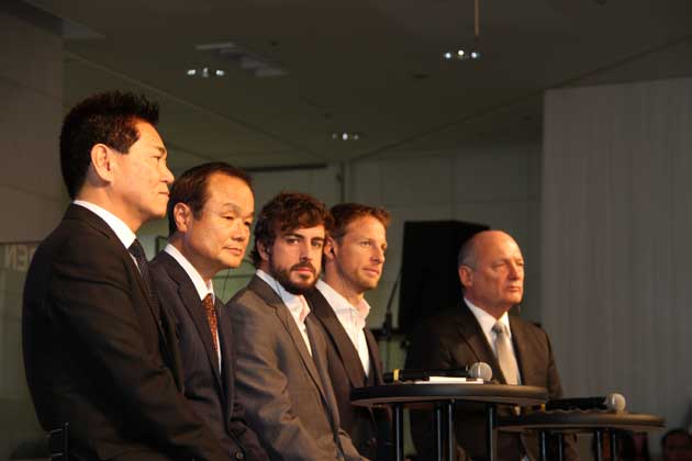 左から新井康久氏、伊藤孝紳氏、フェルナンド・アロンソ選手、ジェンソン・バトン選手、ロン・デニス氏