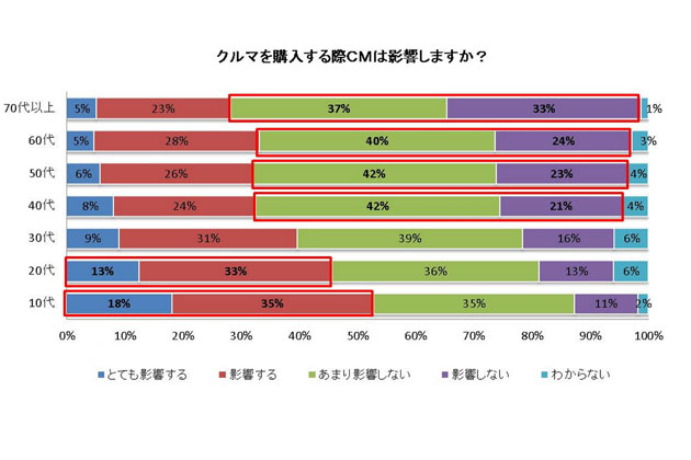 40代~70代では、6割以上がクルマを購入する際にCMのイメージが「影響しない」「あまり影響しない」と回答した。これに対し、20代は46%、10代は53%が「とても影響する」「影響する」と回答しており、若い世代ほどCMの影響を受けることが明らかとなった。