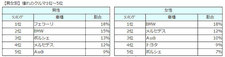▼男女別を見ると、海外メーカーが上位を占める中、女性の「憧れのクルマメーカー」4位には国産メーカーの「トヨタ」が選ばれている。