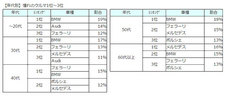 ▼年代別では「BMW」、「フェラーリ」はすべての世代でベスト3に入っており、広く支持されている。