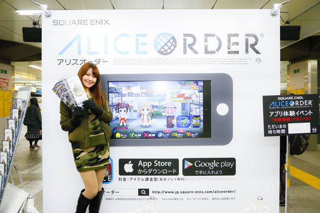 秋葉原駅構内に設置された特設会場では「アリスオーダー」のアプリを体験することができる。イベントコンパニオンがプレイ方法しっかり説明してくれるので、初めてアプリ体験をする人も楽しむことができる。また、体験した人には限定のノベルティグッズをプレゼント。