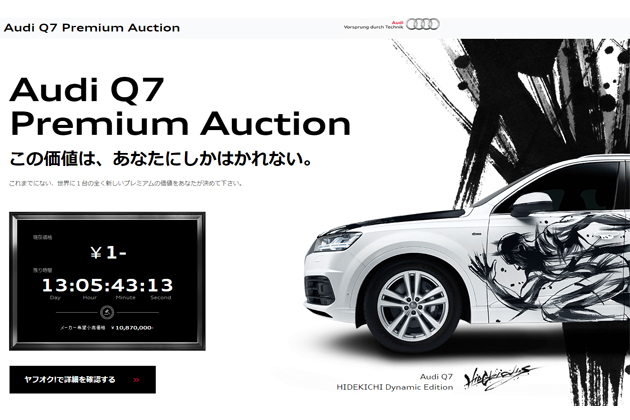 なお、ヤフオクの「プレミアムカーオークション」とは、「ヤフオク!」でしか手に入らない、特別な車のオークション。この記念すべき第一回にアウディジャパンが「Audi Q7 HIDEKICHI Dynamic Edition」を7月4日まで出品する。