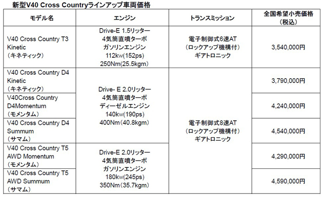 新型V40、V40 Cross Countryでは、新型XC90から導入された新しいグレード体系が採用され、ラインナップを刷新。V40が5グレードから7がグレードに、V40 Cross Countryで4グレードから6グレードとなり、その結果、ユーザーのニーズにこれまで以上に幅広く、きめ細かく応えることが可能となった。