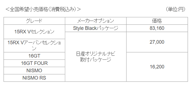 また、「15RX」を除くすべてのグレードに、日産オリジナルナビゲーションの操作をしやすくするナビゲーション連動のステアリングスイッチ、リアスピーカー*、TVアンテナ、GPSアンテナをパッケージとした「日産オリジナルナビ取付パッケージオプション」を設定し、操作性や快適性を向上させた。