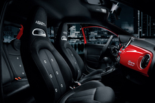 刷新したアバルト595ラインアップの最大の特徴は、前後のバンパーをより一層アグレッシブなデザインに変更した点。また、フロントバンパーのエアインテークには、ワンメイクレース仕様車「ASSETTO CORSE」からインスピレーションを得た「ABARTH」の浮き文字があしらわれ、アバルトならではのレースの雰囲気を強調する。