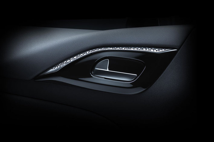 レザースポーツシートを採用したインテリアも黒で統一し、またインナードアハンドルには 3D レーザープリント技術を利用した、複雑で印象的なデザインのチタン製パーツを採用した。