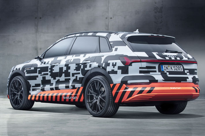 Audi e-tronのプロトタイプは、従来の一般的なカモフラージュの代わりに、特別に開発したデザインフィルムを使用して、車両の電動化システムを表したカモフラージュを纏っている。