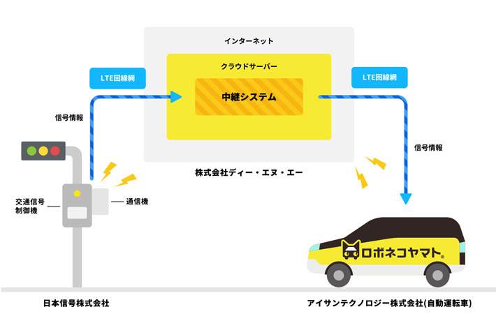 信号制御機に日本信号の専用無線装置を取り付け、リアルタイムに信号の灯色や残り時間などの情報を自動運転車両へ送る。信号情報を受けた車両は、その自動運転システムによって「進む」か「停止」かの制御を行う。