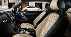ダイヤモンドスティッチが施されたベージュ&ブラックのツートンカラースポーツシートは上質なナパレザーで仕上げられており、華やかで高級感のあるインテリア空間を演出する。また、通常はボディカラーと同色のダッシュパッド、ステアリングホイール、ドアトリムは今回ブラックに統一されており、シートカラーを一層引き立てる。