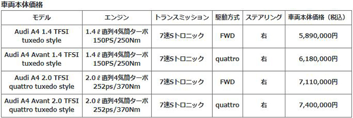 Audi A4 tuxedo styleはAudi A4 1.4 TFSI、Audi A4 2.0 TFSI quattro(それぞれSedan/Avant)をベースとした限定モデル。