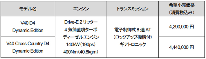 発売価格(消費税込)は、V40 D4 Dynamic Editionが429万円、V40 Cross Country D4 Dynamic Editionが444万円。