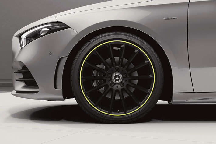 特別仕様車「A180 Edition1」では、イエローグリーンの差し色が入れられた19インチAMGマルチスポークホイールが採用され、足元が引き締まった印象となっている。