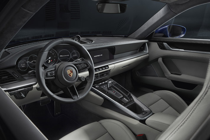 新型911のインテリアは、埋め込まれたメーターを備えたダッシュボードの直線的なラインを特徴とした1970年代の911モデルを想起させる。ポルシェ特有の中央のレブカウンターの横に位置する2つのフレームレスのディスプレイはドライバーに必要な情報を提供する。PCMの10.9インチセンタースクリーンは、新しい構造によって迅速に操作することが可能である。