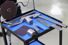 プレス機で加工されたボディパネル上の凹凸を微調整しながら、滑らかで精度の高いラインを生み出す。面を平らに仕上げていくサンダー掛けは、作業者の息継ぎさえも力の伝わり方に影響するほど、繊細な調整が求められる作業だ。