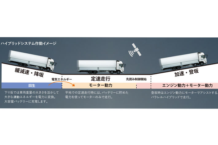 プロフィア ハイブリッドは、AIを活用した世界初のハイブリッドシステムを搭載し、高速道路の走行が主体となる大型トラックの燃費低減を実現した。