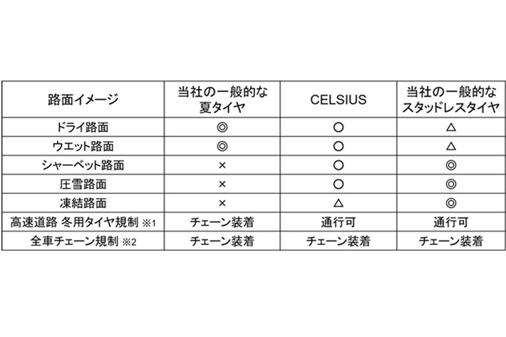 なお、トーヨータイヤでは『「セルシアス」はオールシーズンタイヤでスタッドレスタイヤではありません。過酷な積雪や凍結路がある環境下ではスタッドレスタイヤの使用をお薦めします』とコメントし、スタッドレスタイヤとの用途の違いによる使い分けを推奨している。