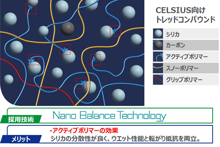 トレッドコンパウンドは独自の材料設計基盤技術「Nano Balance Technology」を用いて開発されており、シリカの分散を向上させるアクティブポリマーを採用している。