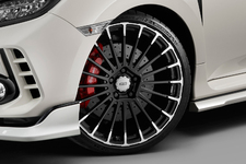 フロントまわりは、よりシャープな印象となるカーボンフロントグリルガーニッシュと、フォグランプガーニッシュにボディ同色のガーニッシュを被せて一体感のあるデザインに。さらに。左右にフィン形状をあしらい、走行安定性を向上するフロントアンダースポイラーを設定。リヤまわりでは、ディフューザー形状を採用し、走りを予感させるデザインを採用している。足もとは、切削鍛造ホイールとし、軽量化と強剛性化を実現。カラーは切削面とツヤ有りブラック塗装の2トーンで引き締まった印象だ。