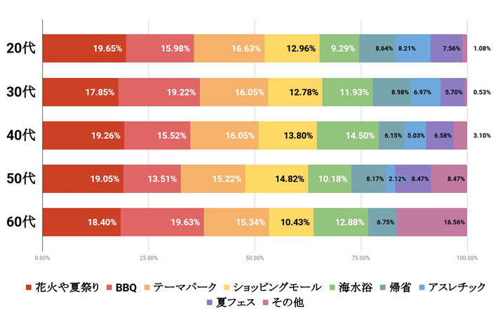 この夏出かけたいスポットを年代別に調査したところ、「花火や夏祭り」「BBQ」「テーマパーク」が共通して人気であることがわかった。