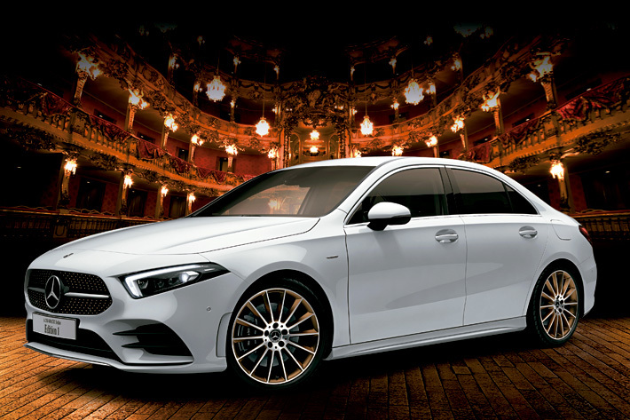 発表記念特別仕様車「A250 4MATIC セダン Edition1」は、外装色にポーラーホワイトを採用し、コッパーアクセント入りブラックダイヤモンドグリルや専用のコッパーアクセントの入った19インチAMGマルチスポークアルミホイール、フロントフェンダーには専用の「Edition」を示すバッジが装備され、スタイリッシュで上品なイメージを演出する。