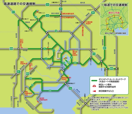 一般道路:環状7号線から都心方向に流入する車両の通行制限を行う。他路線への広域迂回やマイカー利用規制を促す。