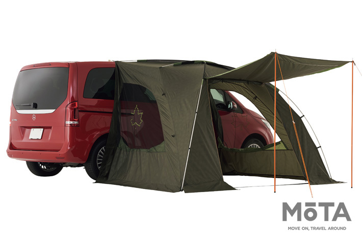 車とタープの行き来がスムーズなワイドタイプとなっており、連結時は正面と両サイドの3方向から出入りが可能だ。