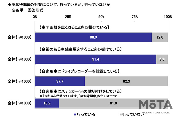 また、あおり運転の対策を行っているかの問いに、88.0%が「車間距離を広く取ることを心掛けている」、91.4%が「余裕のある車線変更をすることを心掛けている」と回答。多くが効果的な対策をとっていることがわかった。他にも自動車にドライブレコーダーを設置や「後方録画中」などのステッカーを貼るといった行為も、あおり運転の抑止に効果があるといわれている。