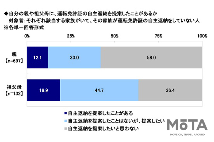また、親・祖父母に対して自主返納を提案したことがあるか聞いた結果、親に対して「自主返納を提案したことがある」は12.1%、「自主返納を提案したことはないが、提案したい」は30.0%、祖父母に対して「自主返納を提案したことがある」は18.9%、「自主返納を提案したことはないが、提案したい」は44.7%となった。