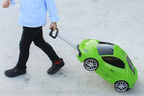 ランボルギーニ型キャリーケースは容量12L、重量約1.8kg、中の収納部分にはメッシュポケットとXバンド付きで本格的に使用できるスグレモノだ。通常のキャスターのほか、クルマの4輪のタイヤも回るため、横にして付属のロープハンドルで引けばエンブレム付きのホイールが回る様子も楽しむことができる。